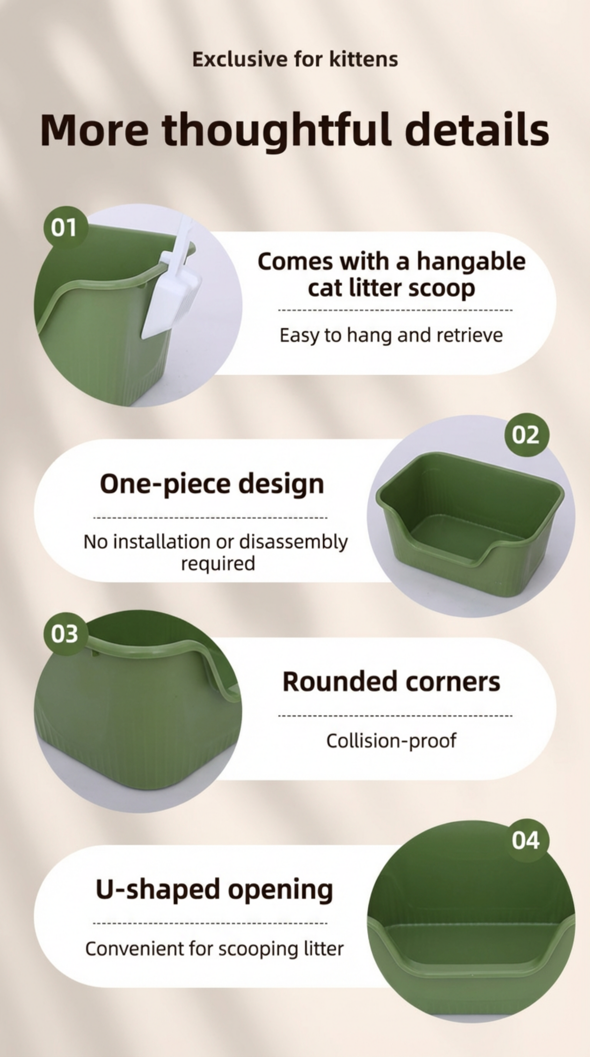 Easy for kittens and senior cats to enter, reducing litter tracking and improving comfort. - One-Piece Durable Design